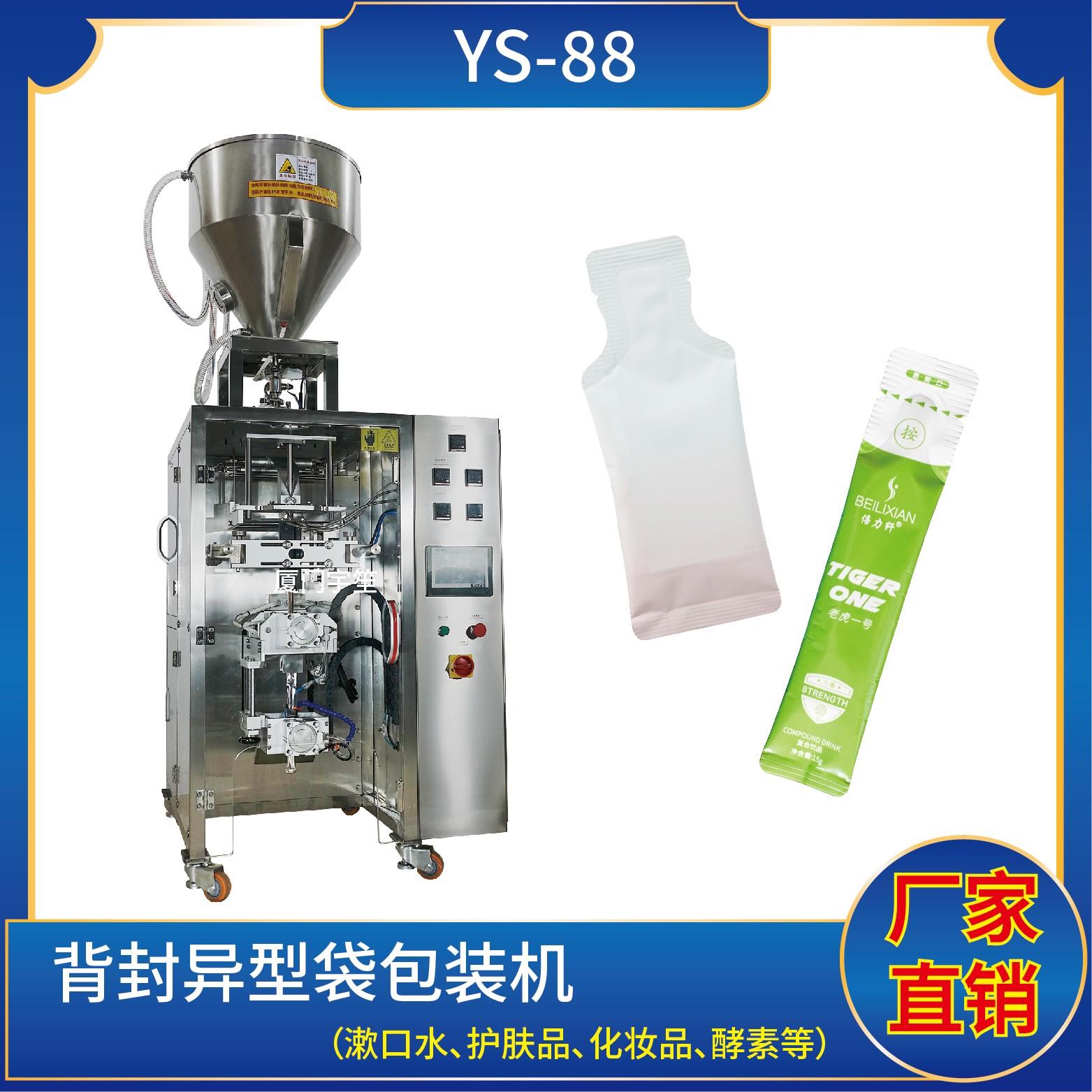 YS-65JL 異型袋包裝機(jī)特 點(diǎn) 1、適用于食品、醫(yī)藥、化工、化妝品行業(yè)中液體、醬料等物品的計(jì)量包裝。2、可自動(dòng)完成制袋、計(jì)量、下料、封合、分切、計(jì)數(shù)、且可根據(jù)客戶要求配置打印批號(hào)等功能。3、觸摸屏操作,PLC 控制,驅(qū)動(dòng)步進(jìn)電機(jī)控制袋長,性能穩(wěn)定、調(diào)整方便、檢測準(zhǔn)確。智能式溫控儀,PID調(diào)節(jié),保證將溫度的誤差范圍…