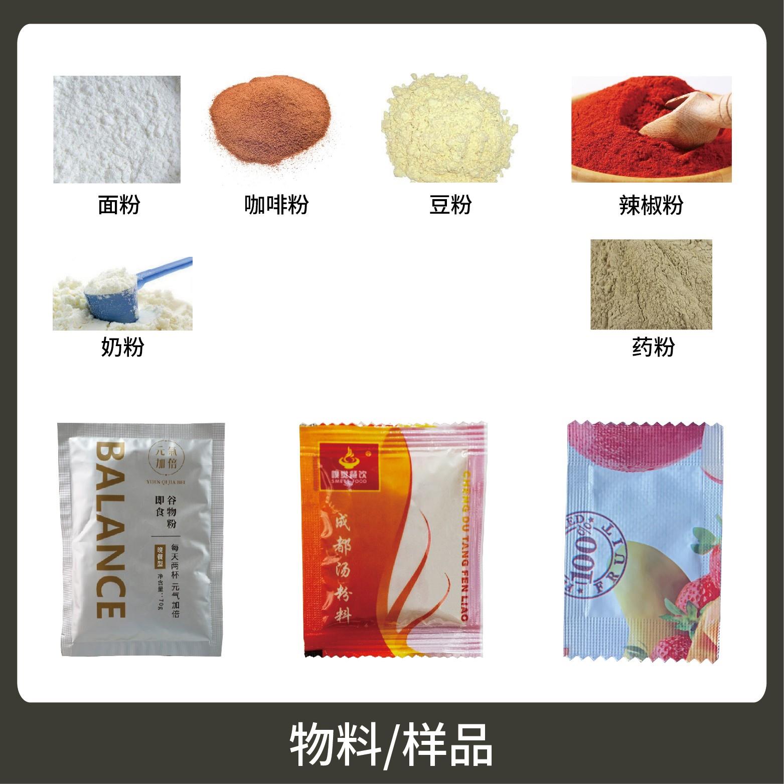 1、適用于食品、醫(yī)藥、化工、化妝品行業(yè)中粉劑物品的計量包裝,如:辣椒粉、咖啡粉、面粉等。