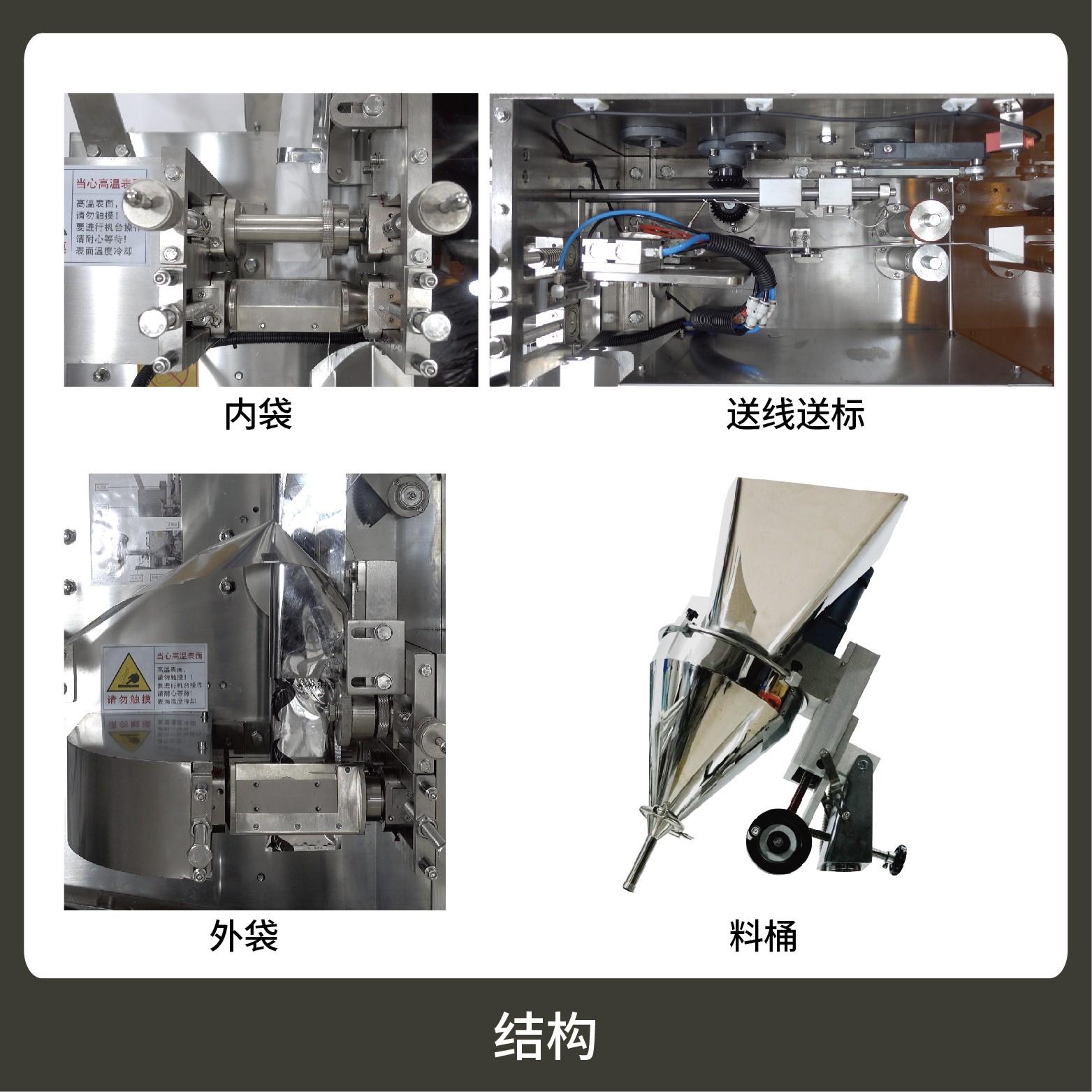 適用于茶葉、藥茶、保健茶草根類(lèi)等小顆粒物的內(nèi)外袋一次性包裝。