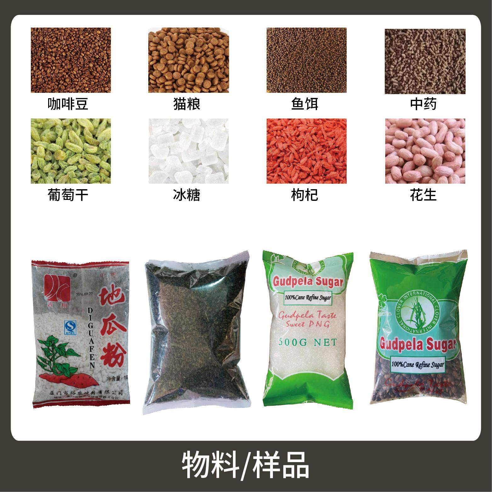 適用于食品、醫(yī)藥、化工、化妝品行業(yè)中顆粒、粉劑、液體、醬料等物品的大克重計量包裝,如:干果、辣椒面、咖啡粉、谷物粉、辣椒油、牛奶、冰袋等。
